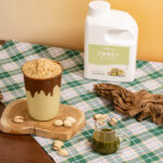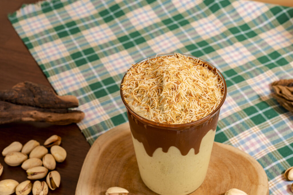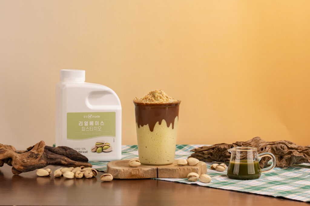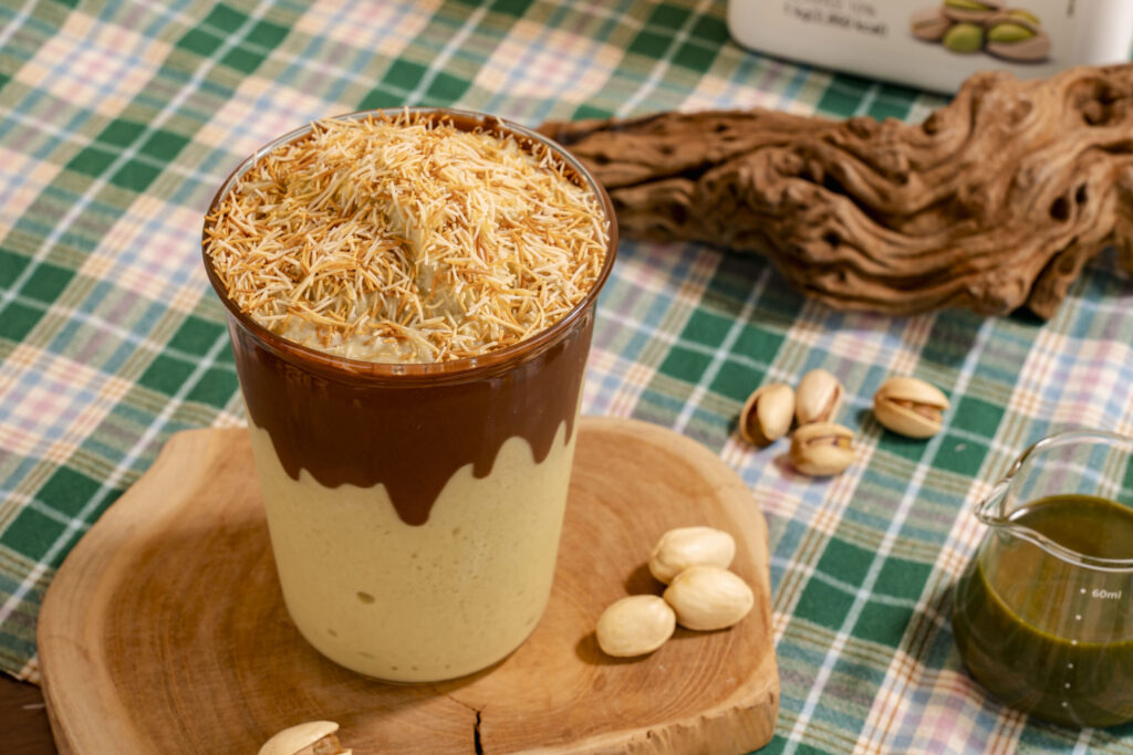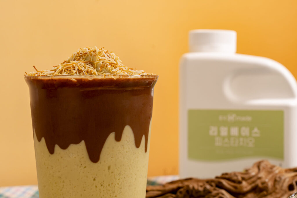 레시피 1. 블렌더 볼에 피스타치오 베이스 80g, 우유 125g, 생크림 25g, 연유 10g, 얼음 250g, 소금 1grind를 담고 블렌딩한다. 2. 잔에 누텔라 5g을 드리즐한다. 3. 블렌딩한 내용물을 잔에 담는다. 4. 구운 카다이프 5g으로 가니시해서 완성한다.