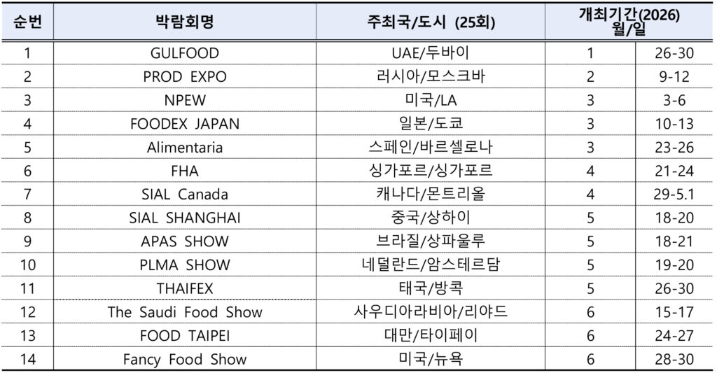 내년 상반기까지 열리는 해외의 주요 식품전은 일본 치바국제식음료전(동계, 2025. 12. 3~5), 이탈리아 볼로냐유기농&천연제품(2026. 2. 22~24), 태국 방콕호레카(2026. 3. 11~13), 그리스 아테네푸드엑스포(2026. 3. 14~16), 중국 청두식음료전(춘계, 2026. 3. 26~28), 아누가브라질(2026. 4. 7~9), 아누가재팬(2026. 4. 15~17), 도쿄제과전시회(2026. 4. 15~17), 아누가차이나(2026. 4. 27~29), 이탈리아 밀라노국제식품전(2026. 5. 11~14), 중국 베이징프랜차이즈전(2026. 5. 29~31), 중국 광저우국제건강산업전(2026. 6. 4~6), 콜롬비아 보고타식품전(2026. 6. 9~12), 필리핀 마닐라식음료전(2026. 6. 10~14), 일본 도쿄국제식음료전(하계, 2026. 6. 24~26) 등이 있다.