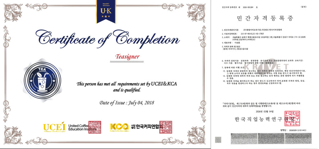 통합커피교육기관(UCEI)와 한국커피연합회(KCA)가 공동으로 추진하는 자격교육 프로그램은 티자이너와 티자니어 매니저 두 가지. 티자이너가 티에 대한 기본적인 이해와 메뉴 만들기에 집중한다면, 티자이너 매니저는 티자이너 관리와 서비스를 총괄한다.