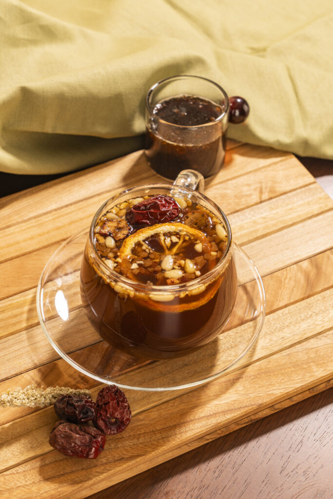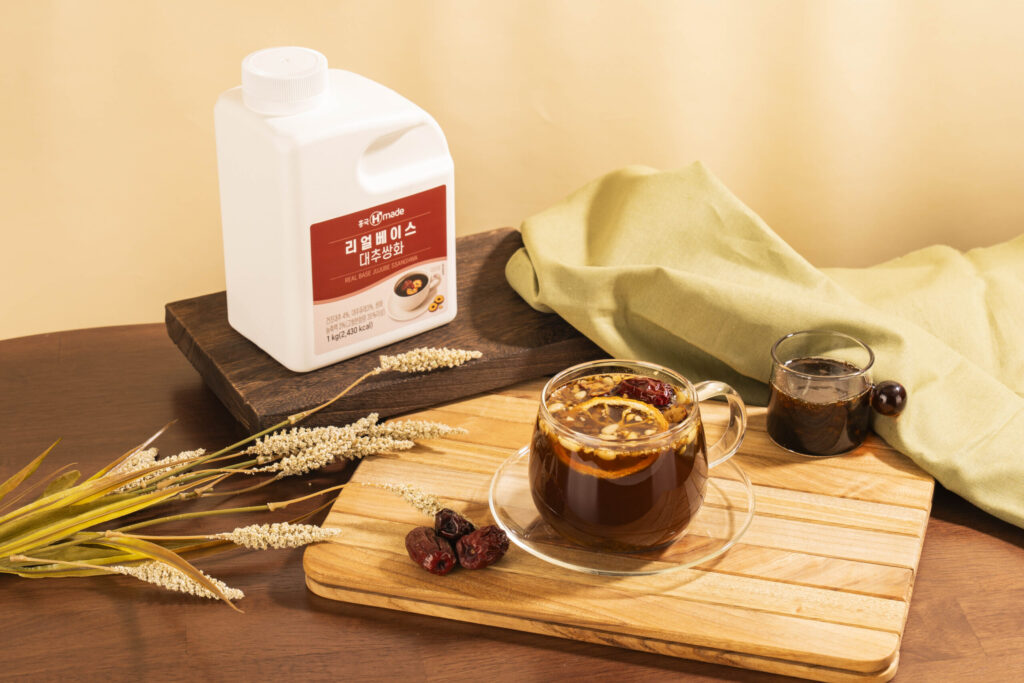 깊고 진한 쌍화의 단맛에 유자의 산뜻한 시트러스 풍미가 조화를 이루는 전통차 음료. 달콤한 쌍화의 깊은 향과 산뜻한 유자의 상큼함이 기분 좋게 어우러지는 메뉴다.재료 대추쌍화 베이스 60g 유자 베이스 30g 꿀 20g 온수 270g (토핑)건 유자 1ea (토핑)대추 1ea (토핑)잣 2g (토핑)대추 슬라이스 2ea