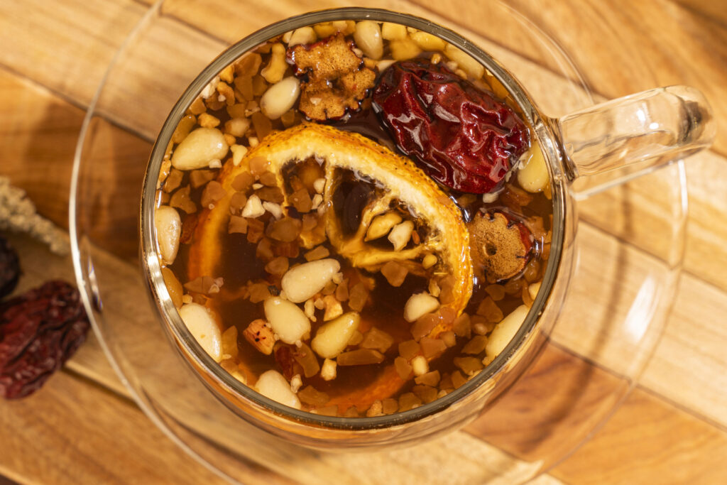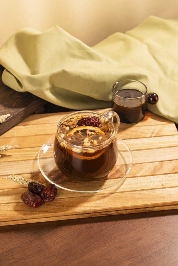 깊고 진한 쌍화의 단맛에 유자의 산뜻한 시트러스 풍미가 조화를 이루는 전통차 음료. 달콤한 쌍화의 깊은 향과 산뜻한 유자의 상큼함이 기분 좋게 어우러지는 메뉴다.재료 대추쌍화 베이스 60g 유자 베이스 30g 꿀 20g 온수 270g (토핑)건 유자 1ea (토핑)대추 1ea (토핑)잣 2g (토핑)대추 슬라이스 2ea