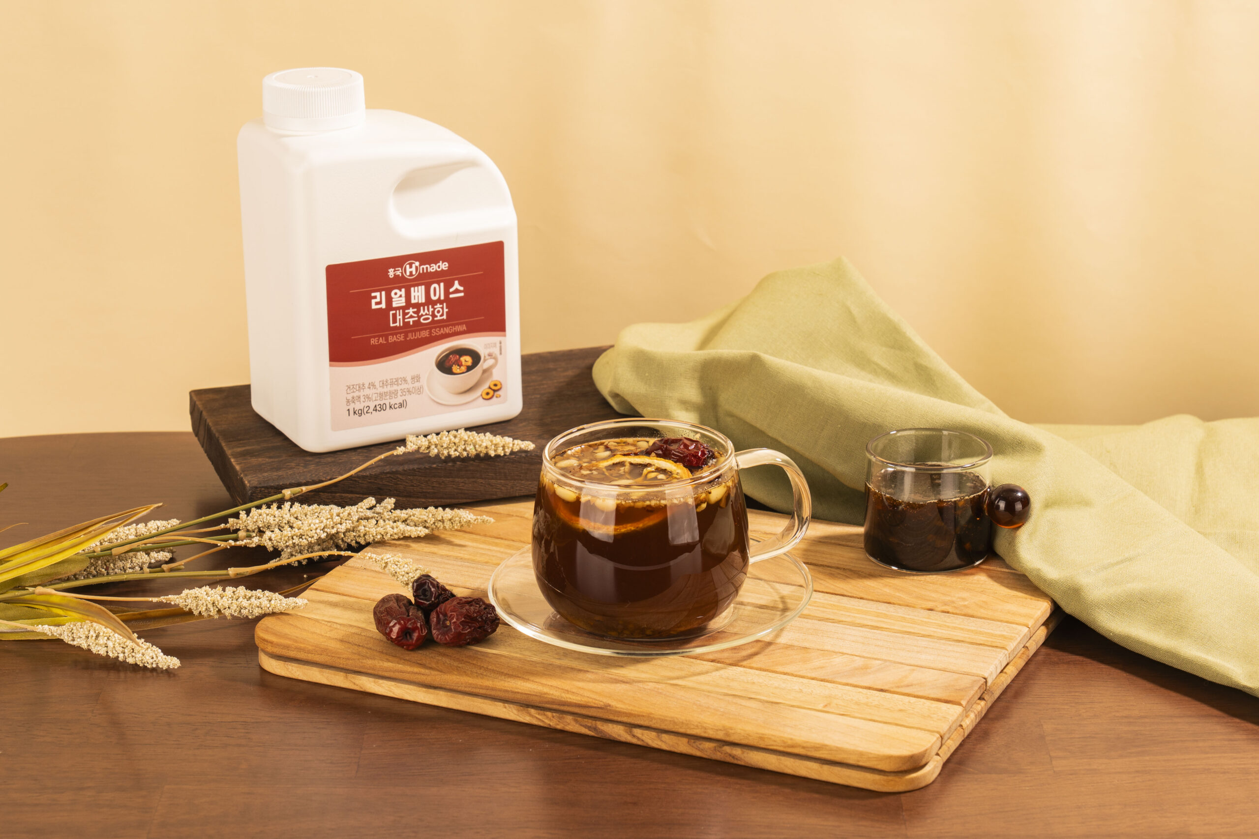깊고 진한 쌍화의 단맛에 유자의 산뜻한 시트러스 풍미가 조화를 이루는 전통차 음료. 달콤한 쌍화의 깊은 향과 산뜻한 유자의 상큼함이 기분 좋게 어우러지는 메뉴다.재료 대추쌍화 베이스 60g 유자 베이스 30g 꿀 20g 온수 270g (토핑)건 유자 1ea (토핑)대추 1ea (토핑)잣 2g (토핑)대추 슬라이스 2ea